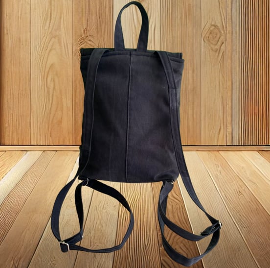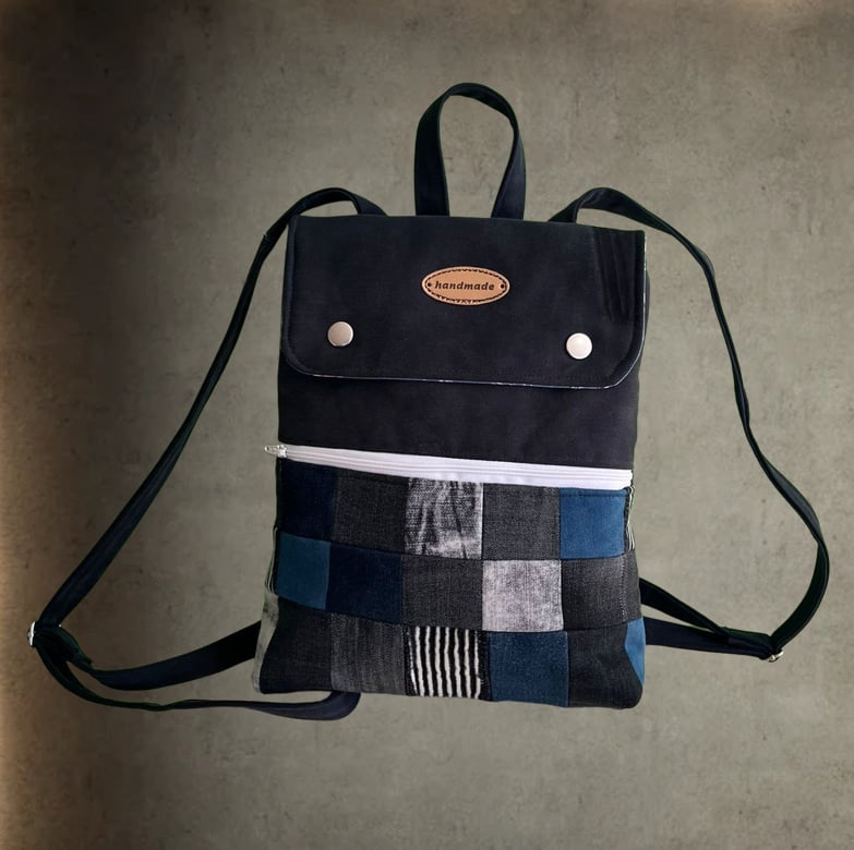 Ein Rucksack für jede Gelegenheit. Aus Patchwork-Jeansstoff, mit Reissverschlusstasche vorne, Klappenverschluss mit 2 Druckknöpfen