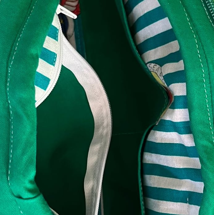 Innenleben: Baumwollstoff, eine Seite mit 2 Eingriffstaschen, andere Seite Reissverschlusstasche