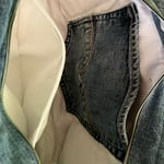 Innenleben: weisser Baumwollstoff, auf einer Seite Jeanseingriffstasche auf der anderen Seite Reissverschlusstasche